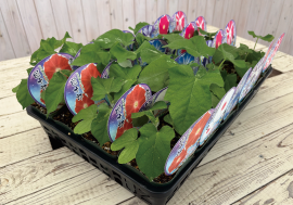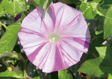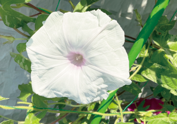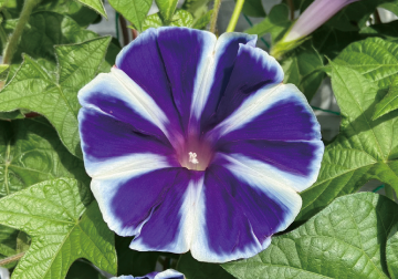 | 手まり | 通常の朝顔より比較的長く咲きます。白い縁取りが入り、色合いがとても綺麗です。 葉に斑が入るのが特徴です。 |